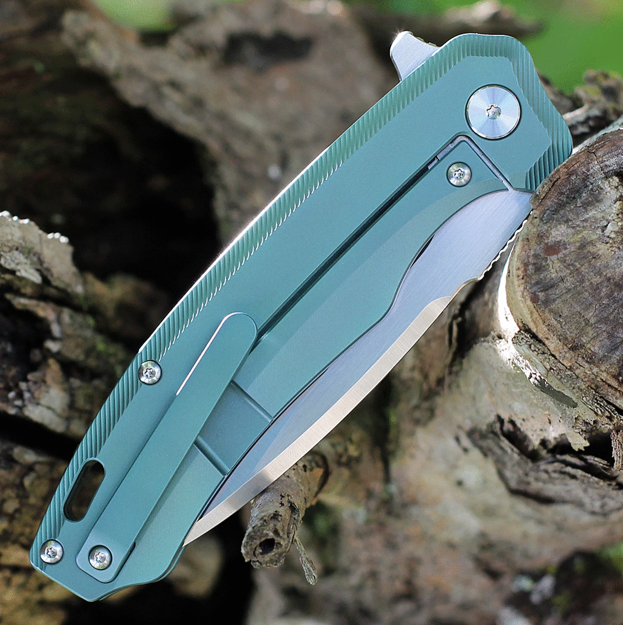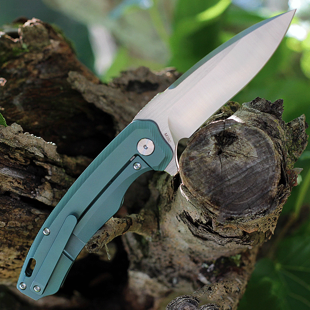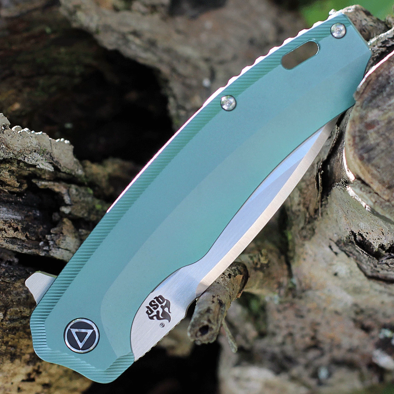 QSP Knife Woodpecker QS116-B II, 3.75″ Bohler M390 Two-Tone Satin Drop Point Blade, Green Titanium Handle