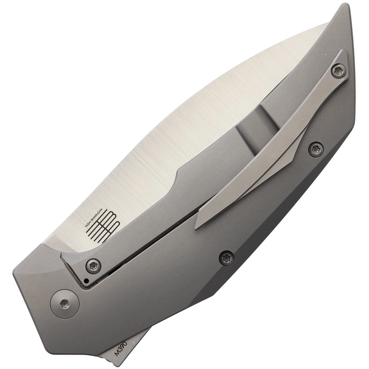 This Reate T4000 is made with Bohler M390 stainless steel blade and a gray titanium handle with green linen micarta inlay. The T4000 features a 4.0″ satin spear point blade with a flipper for easy opening and a liner lock.