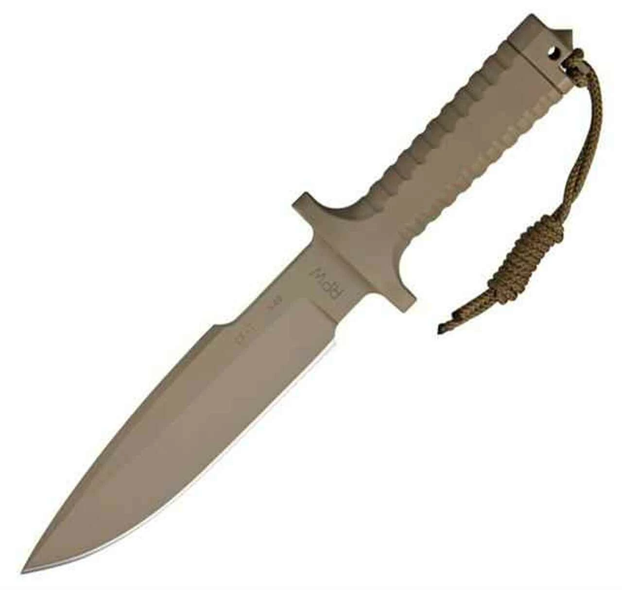 This integral knife is all Armor black CeraKote finish with a fluted handle for no slip grip and a drop point blade with a false top edge. Makers mark and serial number stamped on blade (serial number may differ from knife pictured). Includes original box and paperwork with a letter of authenticity and a “Spec Ops Combat Master” nylon sheath. These knives are some of the first 45 made in this production and have a case hardened butt cap with a conical glass breaker. This is an upgrade for any knife made after the first 45. Brand new from maker.