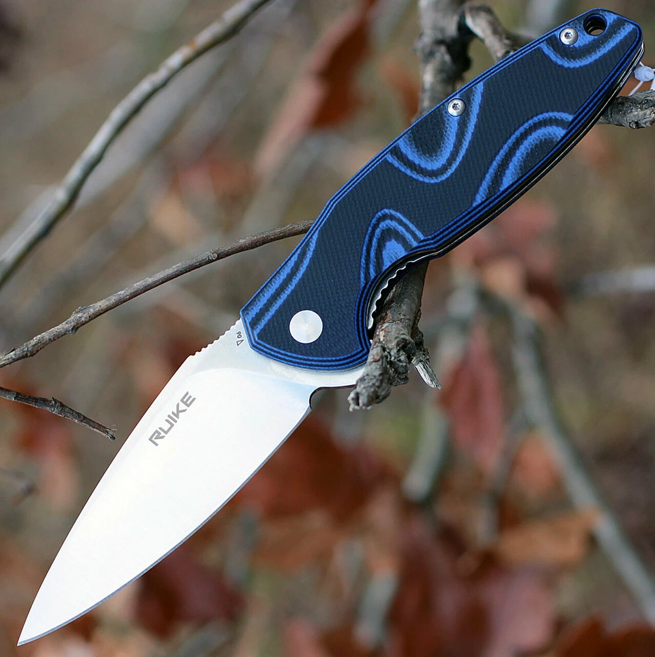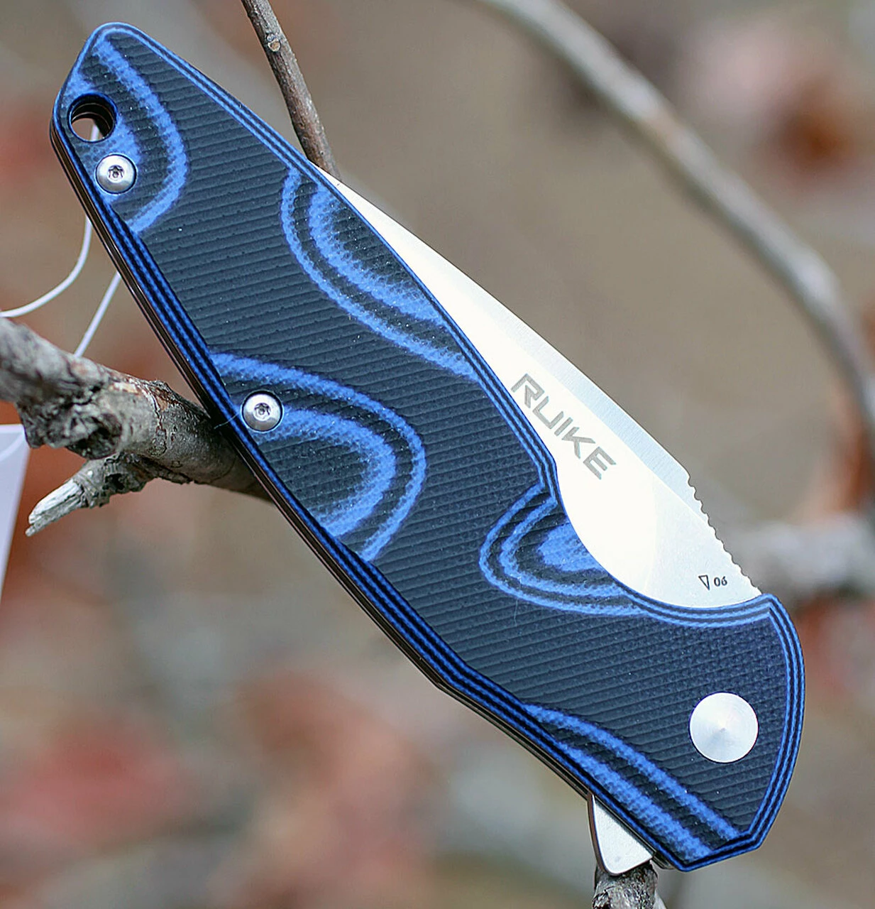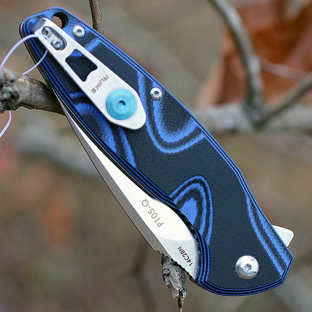 Ruike Fang P105Q, 3.6″ 14C28N Plain Blade, Black/Blue G-10 Handle