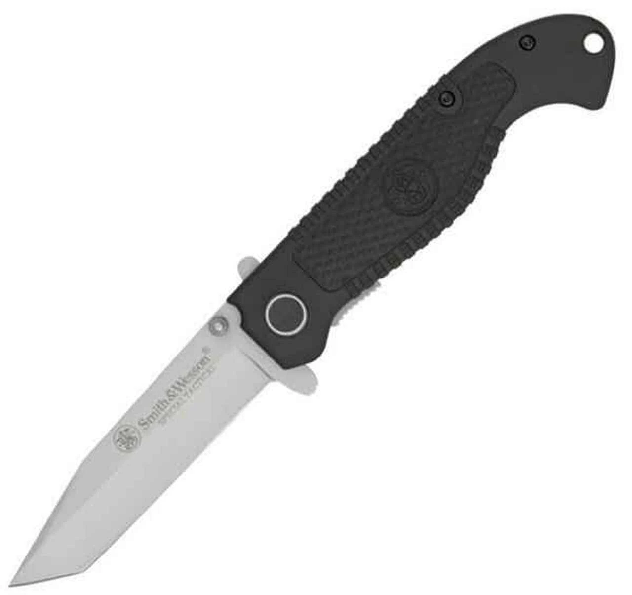 Smith & Wesson Linerlock Tanto. Standard edge matte finish blade. 4 5/8″ closed. Stainless tanto blade with dual thumb studs. Black rubberized metal handles with textured sure grip inserts. Lanyard hole. Black finish pocket clip.