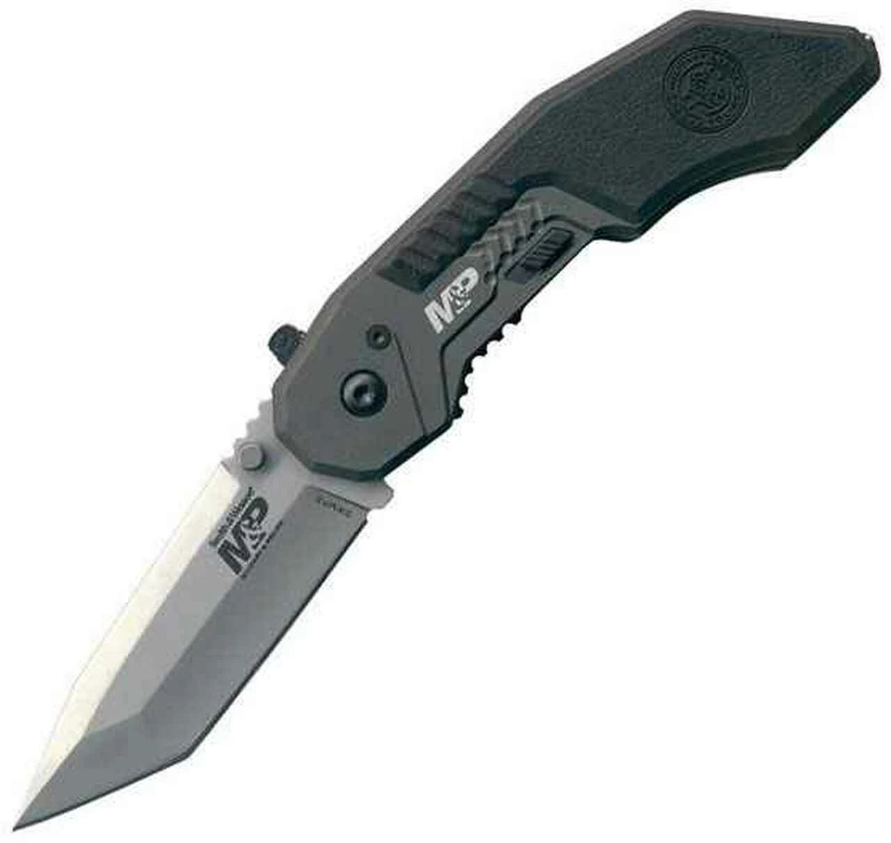 S&W M&P3 Assisted Opener Plain. M&P (Military & Police) Linerlock. 4 1/4″ closed linerlock. 4034 stainless tanto blade with dual thumb studs. Dark gray anodized aircraft aluminum handles with black rubberized inlay and integrated glass breaker. Black finish stainless pocket clip. M.A.G.I.C. assisted opening blade.