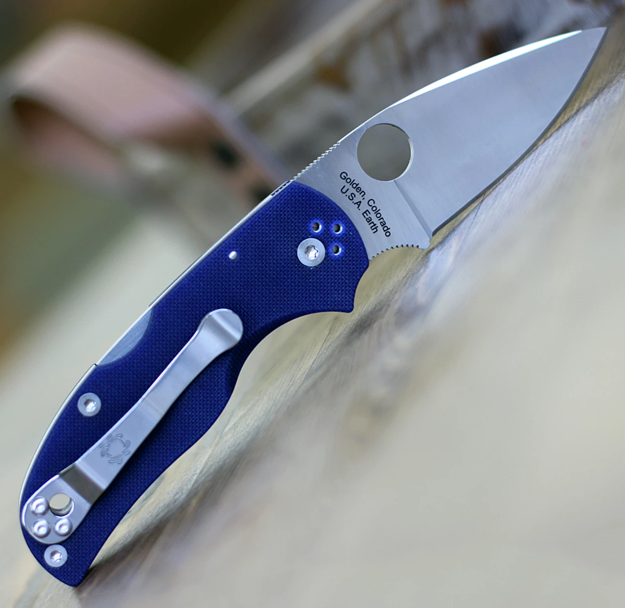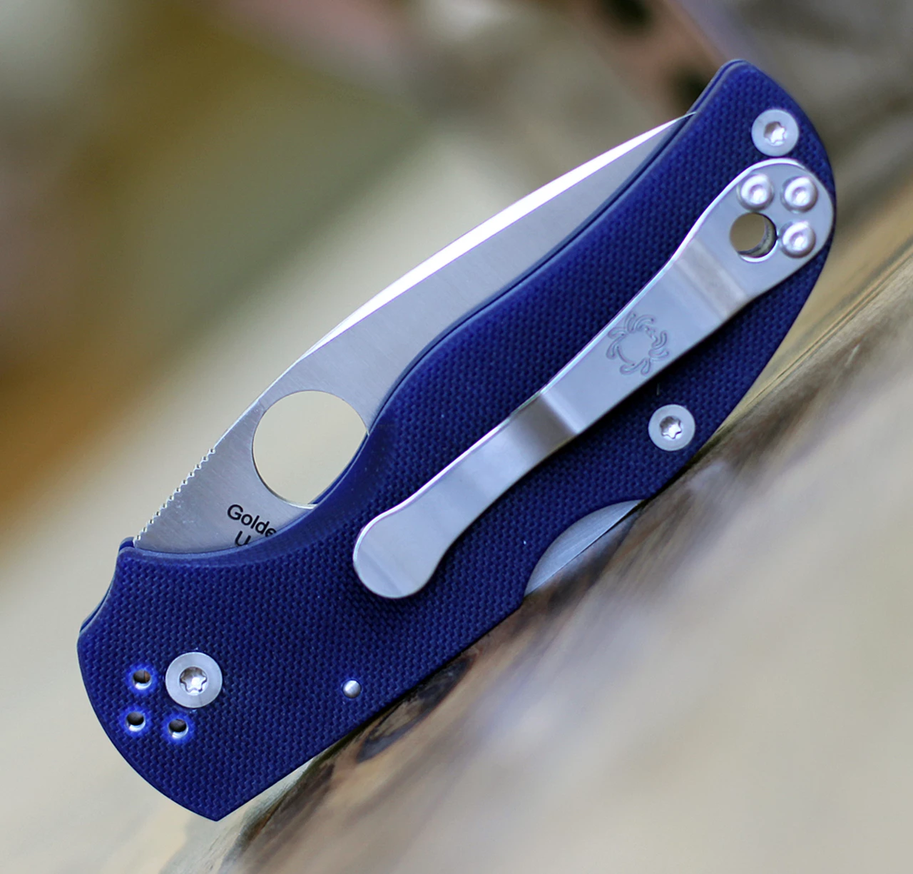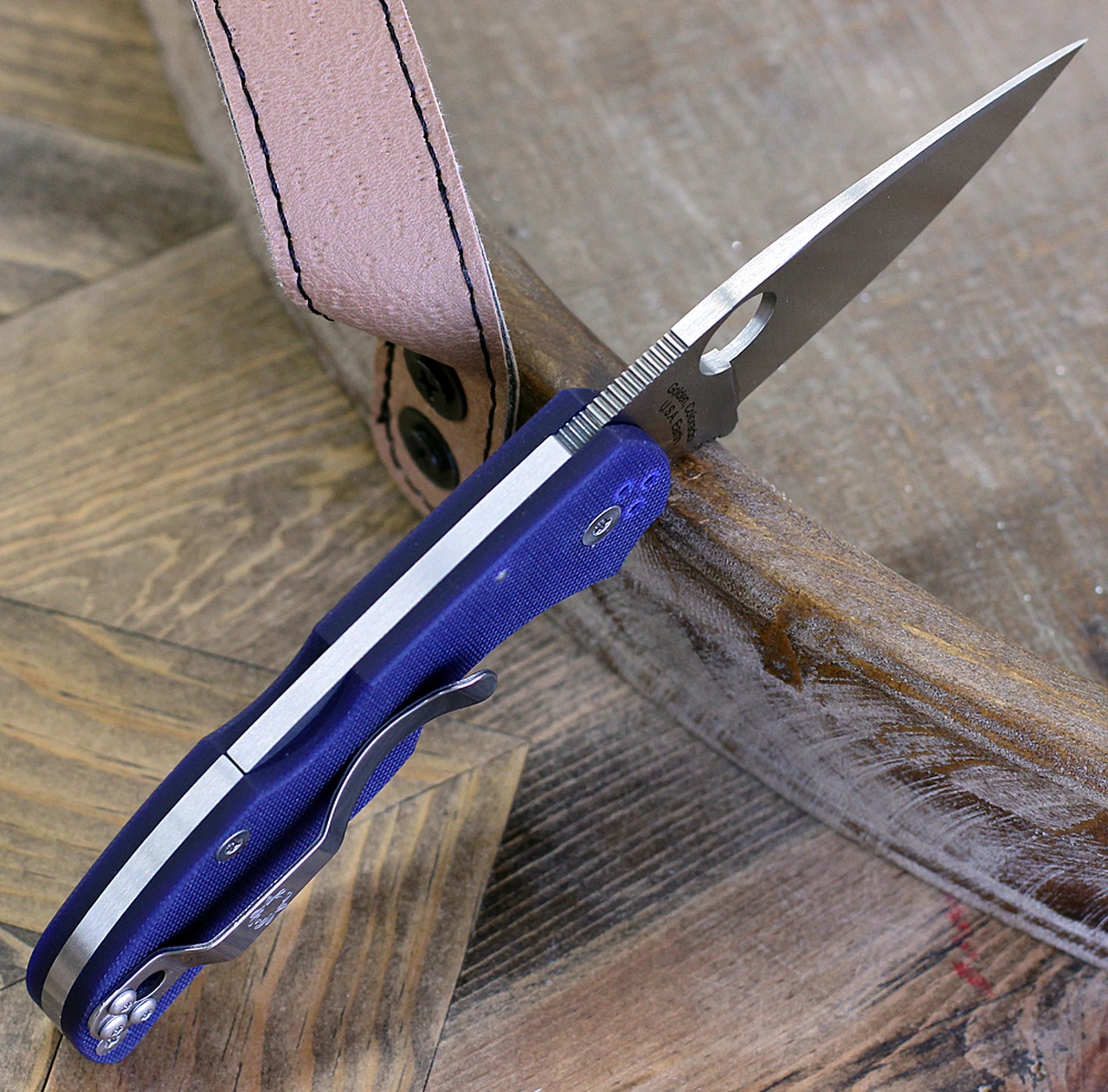 The Native 5’s linerless handle utilizes textured dark blue G-10 scales that are the signature color of Spyderco’s elite family of CPM S110V knives. To ensure convenient carry and instant access, the handle includes a broad-based four-position clip that supports left or right-side tip-up or tip-down carry.