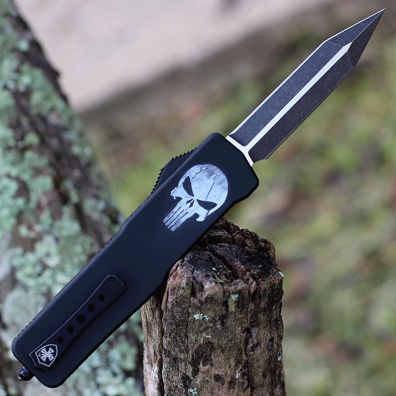 Templar Knife Premium Lightweight Series – Large OTF Automatic (LA-FL-12-1) – 3.55″ Powder D2 Black SW Dagger, Aluminum Fallen Skull Handle