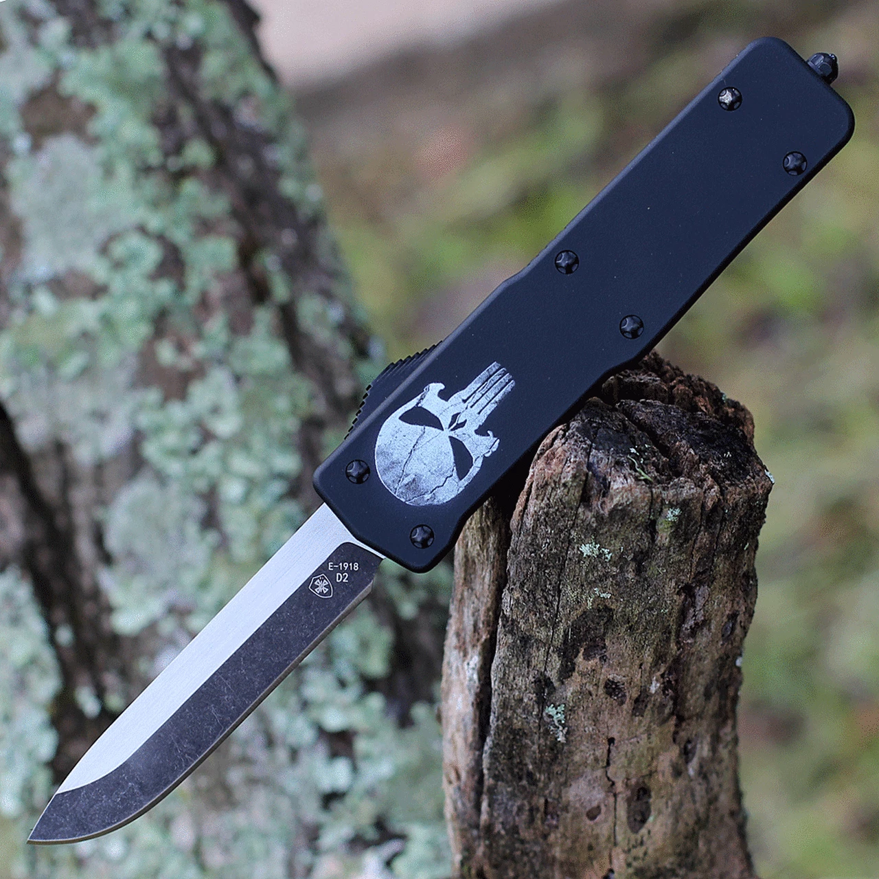 Templar Knife Premium Lightweight Series – Large OTF Automatic (LA-FL-32-1) – 3.55″ Powder D2 Black SW Drop Point, Aluminum Fallen Skull Handle