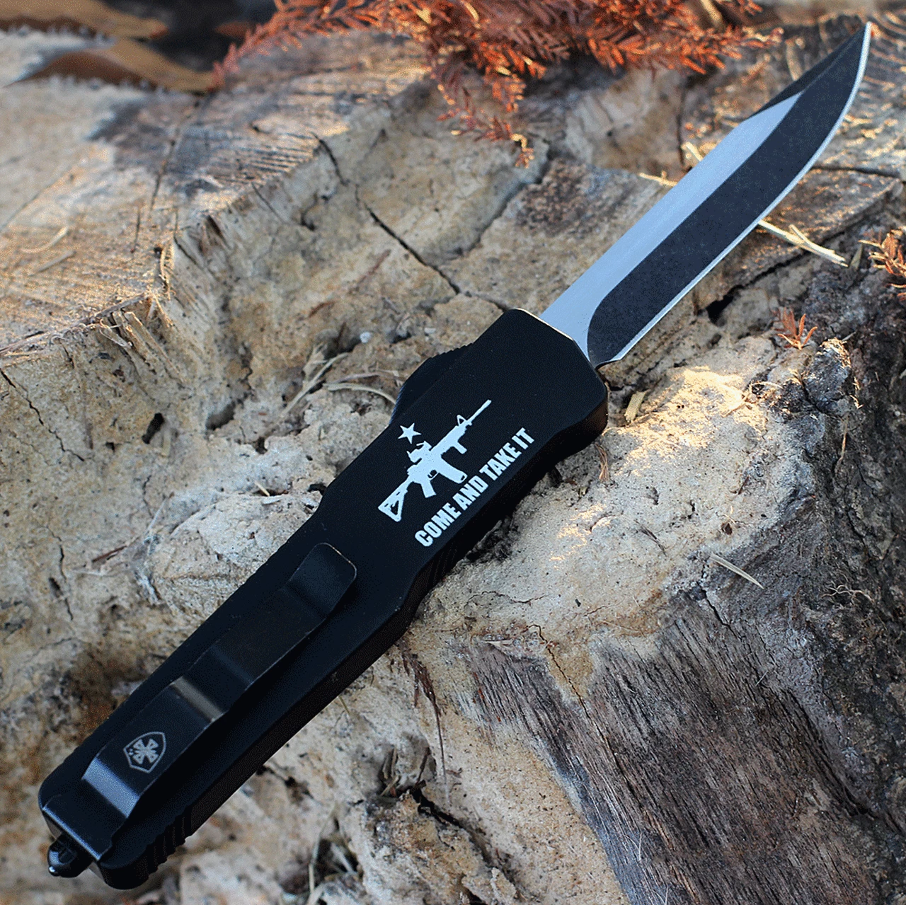 Templar Knife Premium Lightweight Series – Slim OTF Automatic (MA-AR15-32-1) – 3″ Powder D2 Black SW Drop Point, Aluminum Black “Come And take It” W/ AR15 Handle