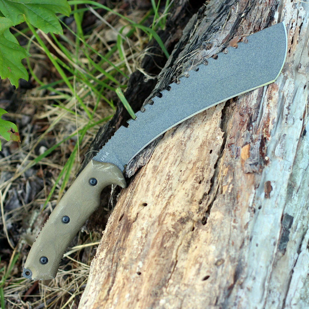 The Tundra Trekker comes with our robust Tactical Stone powder coat finish, Green Canvas Micarta, and an open-backed Kydex sheath with a leather dangler to make it easy to carry through thick brush and trees. It will excel in anything from chopping wood, to making traps and tent pegs, clearing brush, and whatever else you might decide to throw its way.