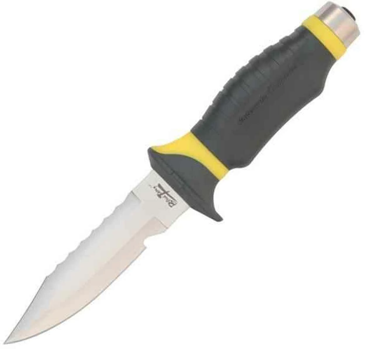 Underwater Kinetics Dive Knife Blue Tang Hydralloy 10″ overall. 3 3/4″ Hydralloy clip blade features serrated edge, smooth edge, and hooked line cutter. Black and yellow handle with soft rubber thumb guard allows hand to wrap firmly around choil. Hydralloy signalling pommel. Black polycarbonate sheath features one hand push button release and strap mounting brackets. Includes two quick release ozone resistant rubber leg straps. Knife easily disassembles for cleaning.