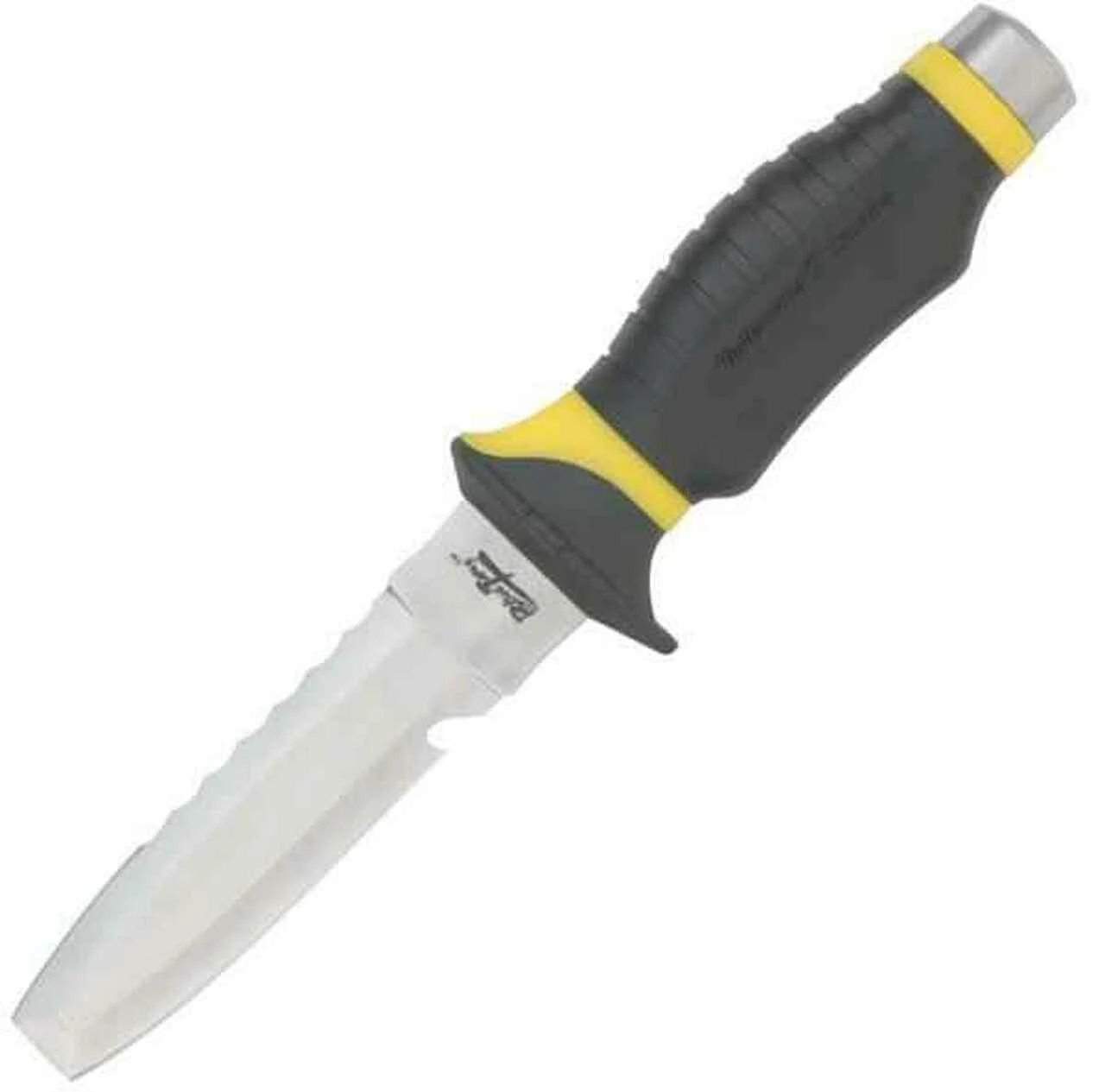 Underwater Kinetics Dive Knife Blue Tang Hydralloy. 10″ overall. 3 3/4″ Hydralloy blunt tip blade features serrated edge, smooth edge, and hooked line cutter. Yellow handle with soft rubber thumb guard allows hand to wrap firmly around choil. Hydralloy signalling pommel. Black polycarbonate sheath features one hand push button release and strap mounting brackets. Includes two quick release ozone resistant rubber leg straps. Knife easily disassembles for cleaning.