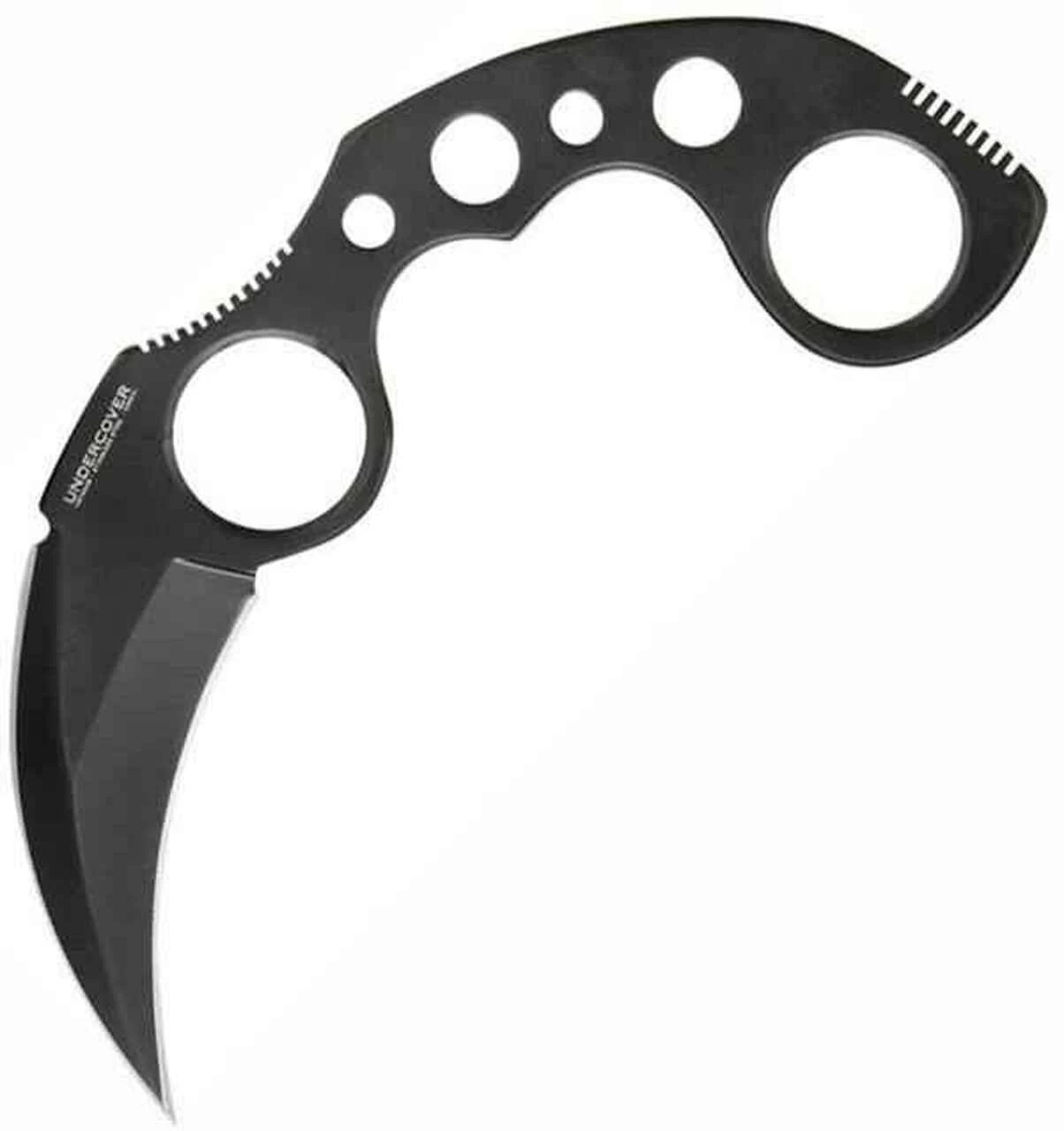 United Undercover Karambit. One piece black finish 420 stainless construction. 6 1/2″ overall. 3 3/8″ blade. Generous size finger holes. Molded black impact-resistant ABS sheath with clip.