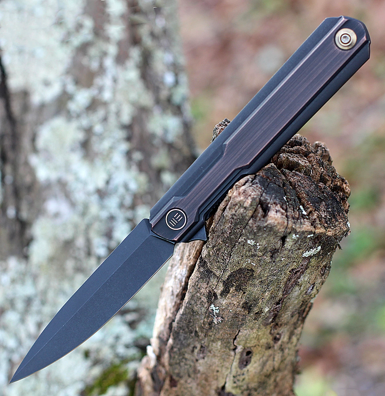 The WE Knife Co. Peer is a slender gentleman’s knife that fits in on any occasion. It’s made of a titanium handle with black hand rubbed copper handle.
