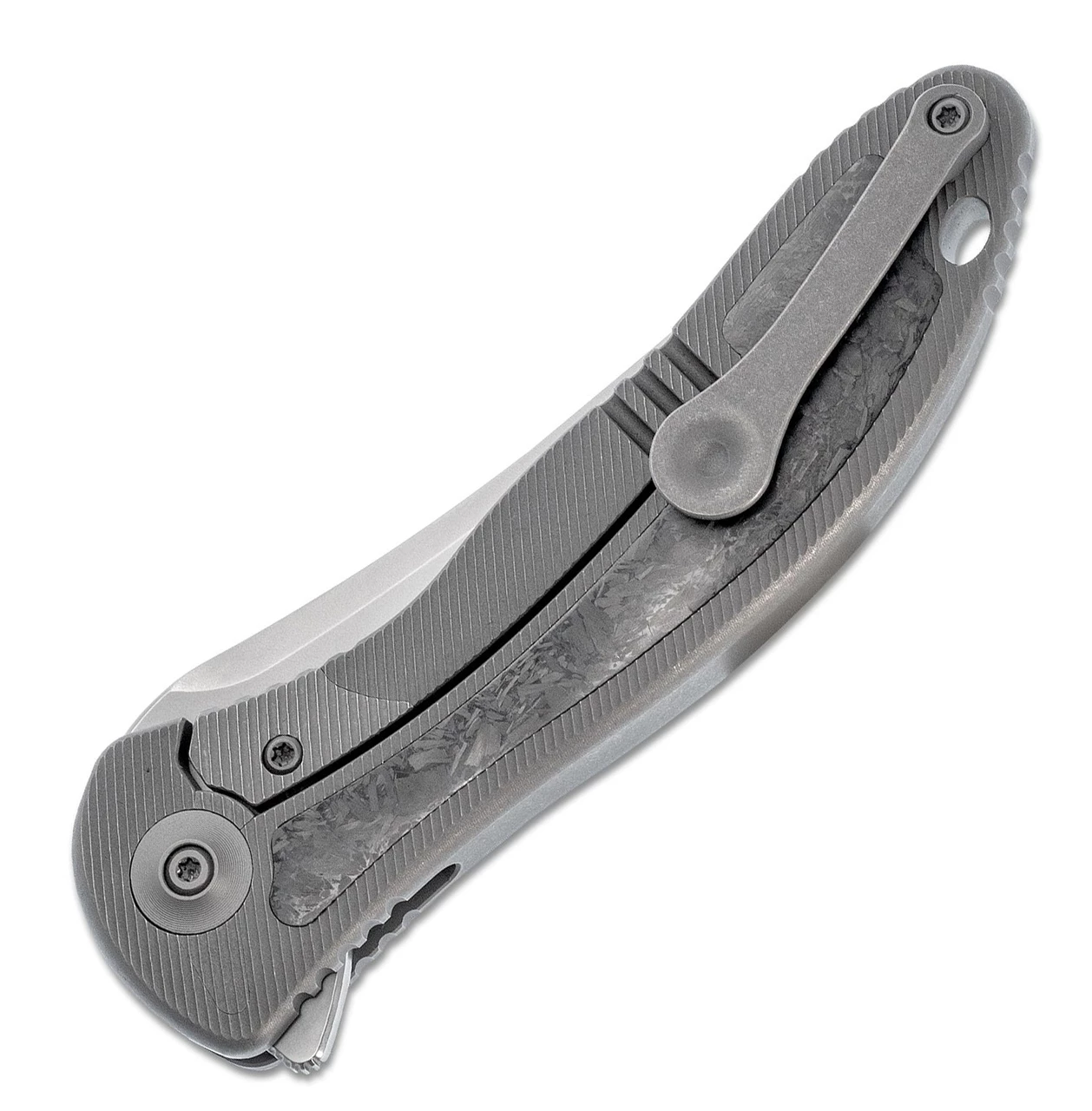 WE Knife Co. Synergy 2 Folding Knife 912CF-A, 3.49″ M390 Stonewashed Trailing Point Blade, Gray Integral Titanium Handle w/Shred Carbon Fiber Inlays