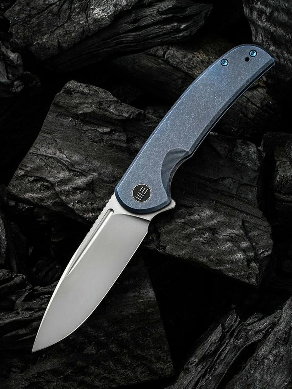 WE Knife Beacon Frame Lock (WE20061B-2) – 3.5″ CPM 20CV Silver Bead Blast Drop Point Blade, Blue Stonewashed Titanium Handle