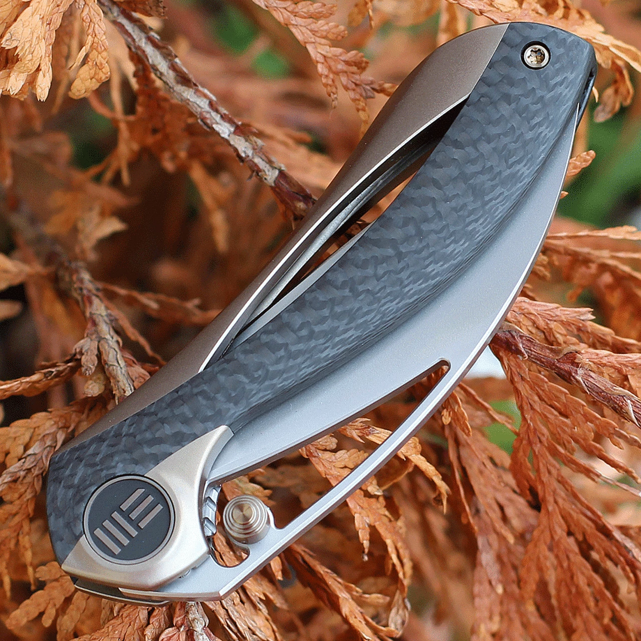 WE Knife Co. Pleroma (821B) – 2.95” Bohler M390 Wharncliffe Satin Plain Blade, Champagne Titanium with Carbon Fiber Integral Handle