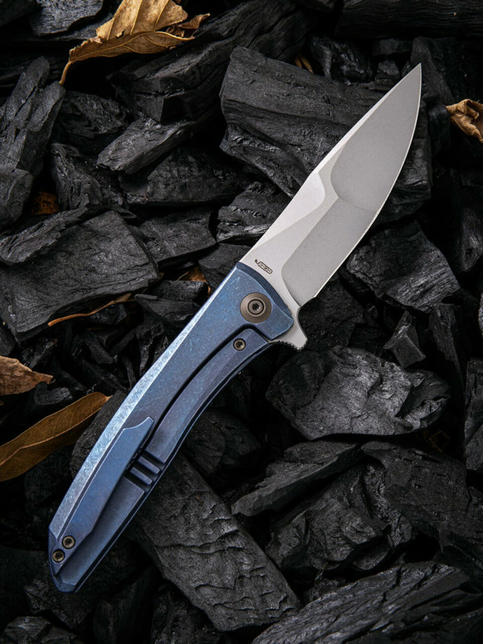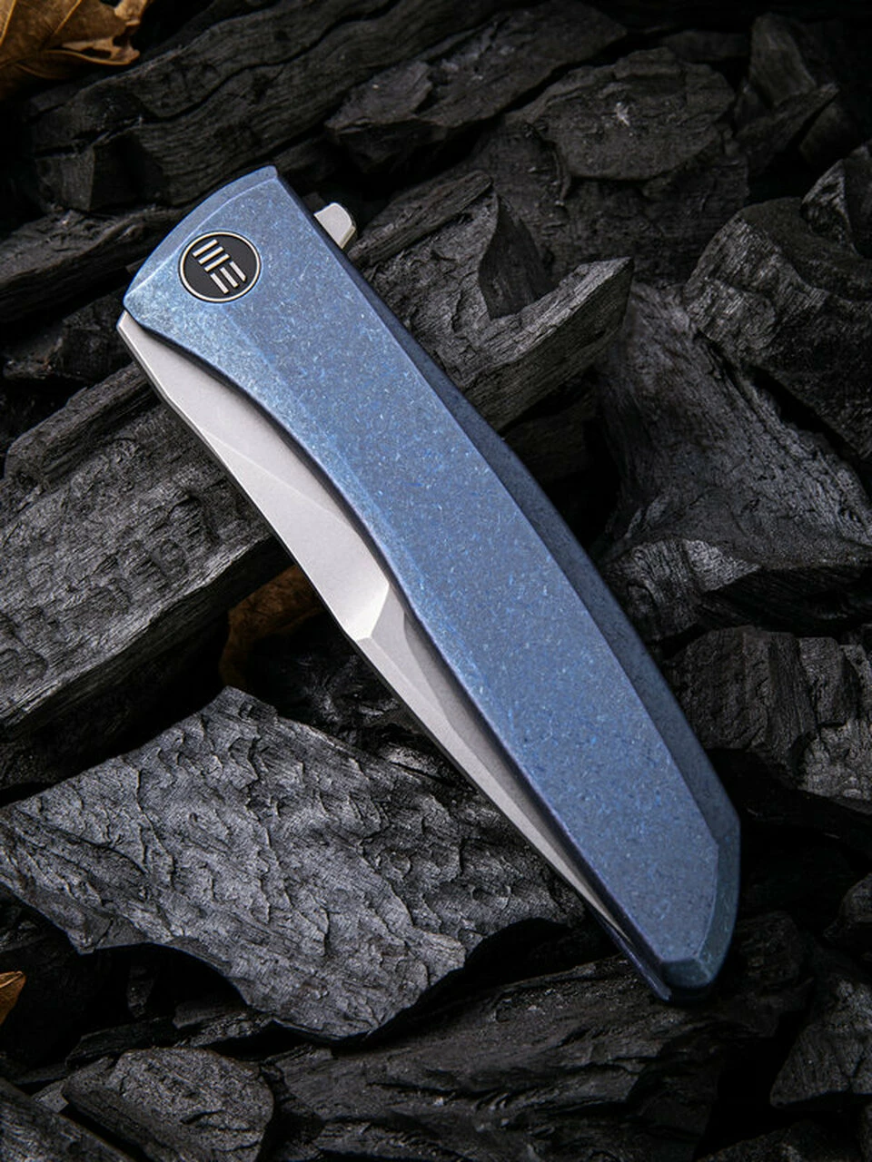 The 923 Scoppio model from We Knives is a slim and functional knife with an attractive design. It flips open extremely smoothly and quickly since it rides on ceramic bearings with a nice thwack upon lockup. The 3.63″ drop point blade is made from CPM-20CV stainless steel with a matte stonewash finish and an intricate compound grind. The properly designed flipper tab rockets the blade out and also doubles as a finger guard while open. The excellent handle is made from 6Al4V titanium with a stonewashed then blue anodized finish. The shape locks it into your hand perfectly for extended hard use cutting tasks. The pocket clip, screws, pivot cap, and washers are all 6Al4V titanium for maximum quality assurance and you have a replaceable lockbar insert for longevity. This is an excellent tactical design that can flex into an EDC role easily and effectively, proudly manufactured in China to extremely precise tolerances.