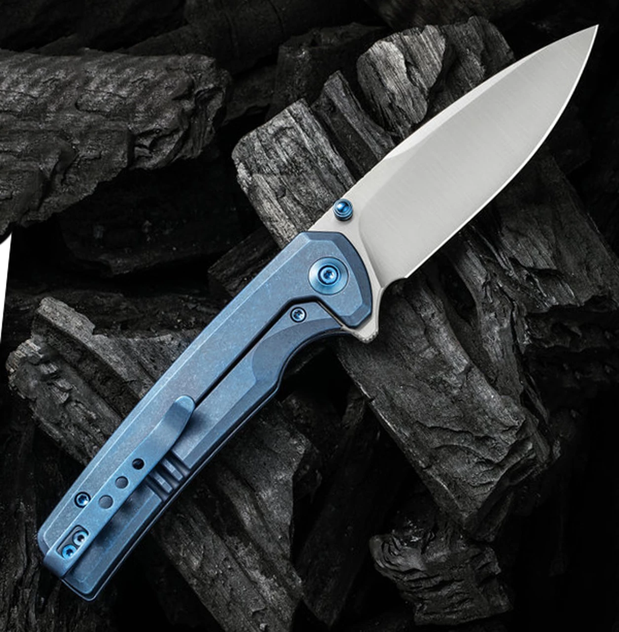 WE Knife Co. Subjugator Frame Lock (WE 21014C-3) – 3.48″ CPM 20CV Satin Drop Point Blade, Blue Stonewashed Titanium Handle