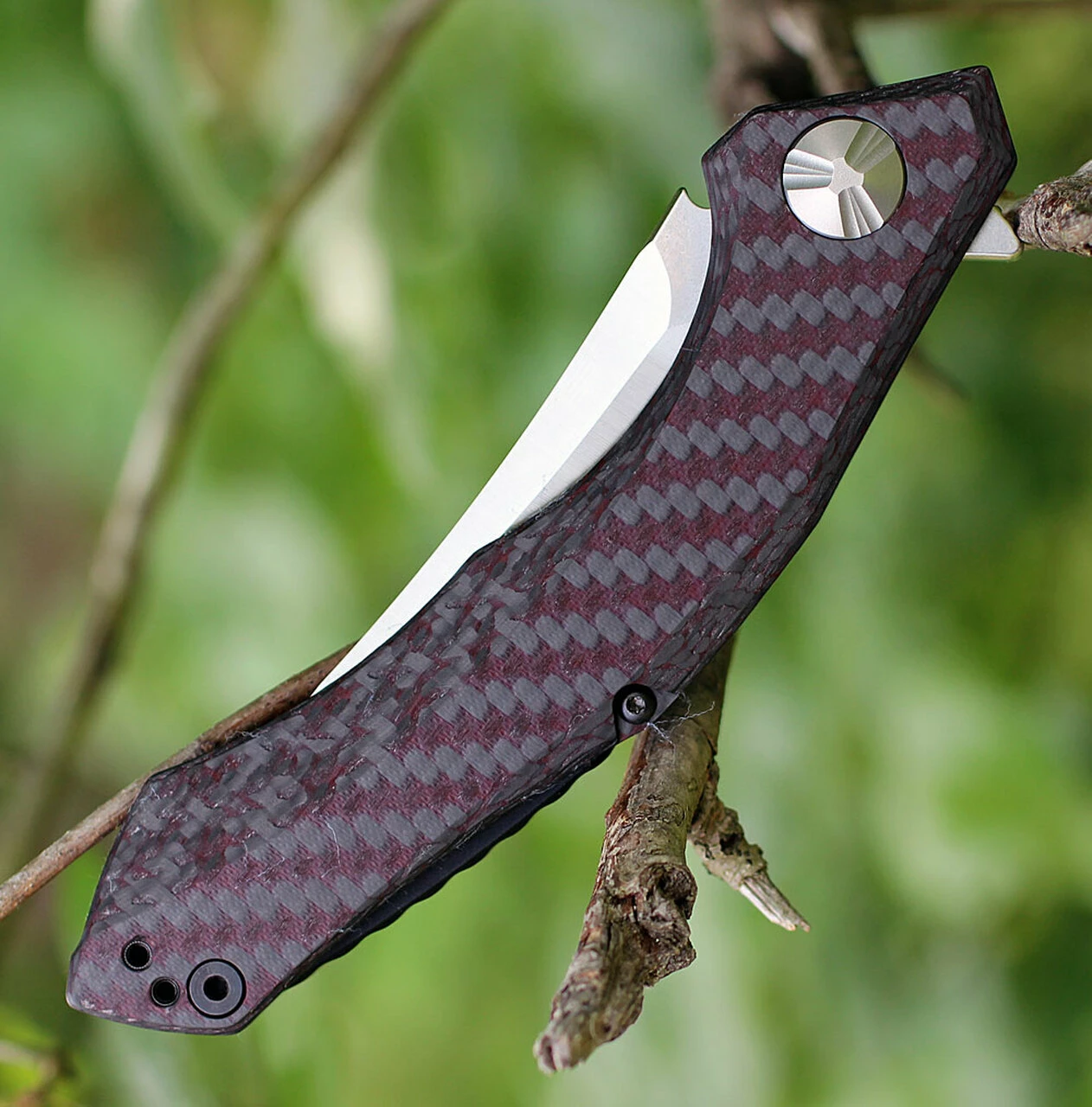 - Handle: Red carbon fiber composite front, stonewashed titanium back